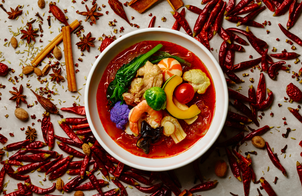 タイのトムヤムクンベースの旨味とスパイスの香りが重なり、ココナッツのやさしい甘みが後を引く、女性にも人気の“ヤミツキッ系”アジアン『トムヤム麻辣湯スープ』など…香る、痺れる、潤う。五感を刺激する澤田流、進化した麻辣湯を是非ご賞味ください。